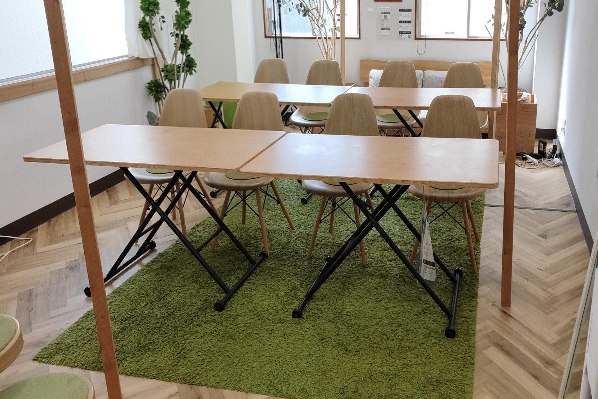 | 設備 | 天井蛍光灯・(昼白色)ウォールランプ・ストリングライト(電球色)・LEDキャンドル | キャスター付昇降式テーブル 120×60cm 4台 ※耐荷重20kg 上れません | 椅子10脚+予備2脚・丸椅子4脚(合計14脚)・ソファー1脚 | ホワイトボード 90×120cm・マーカー・イレーザー・マグネット 着席両面記述 |