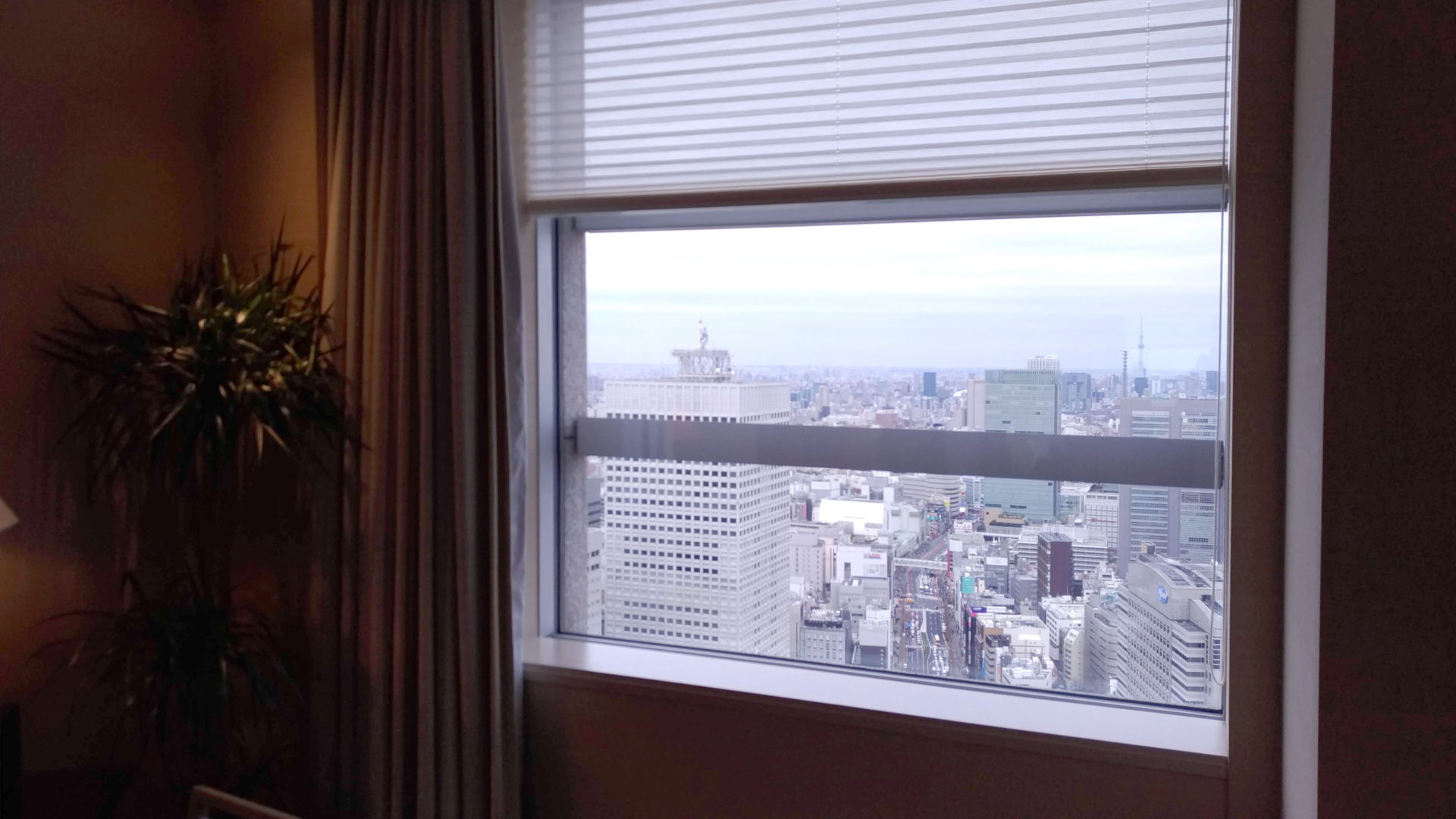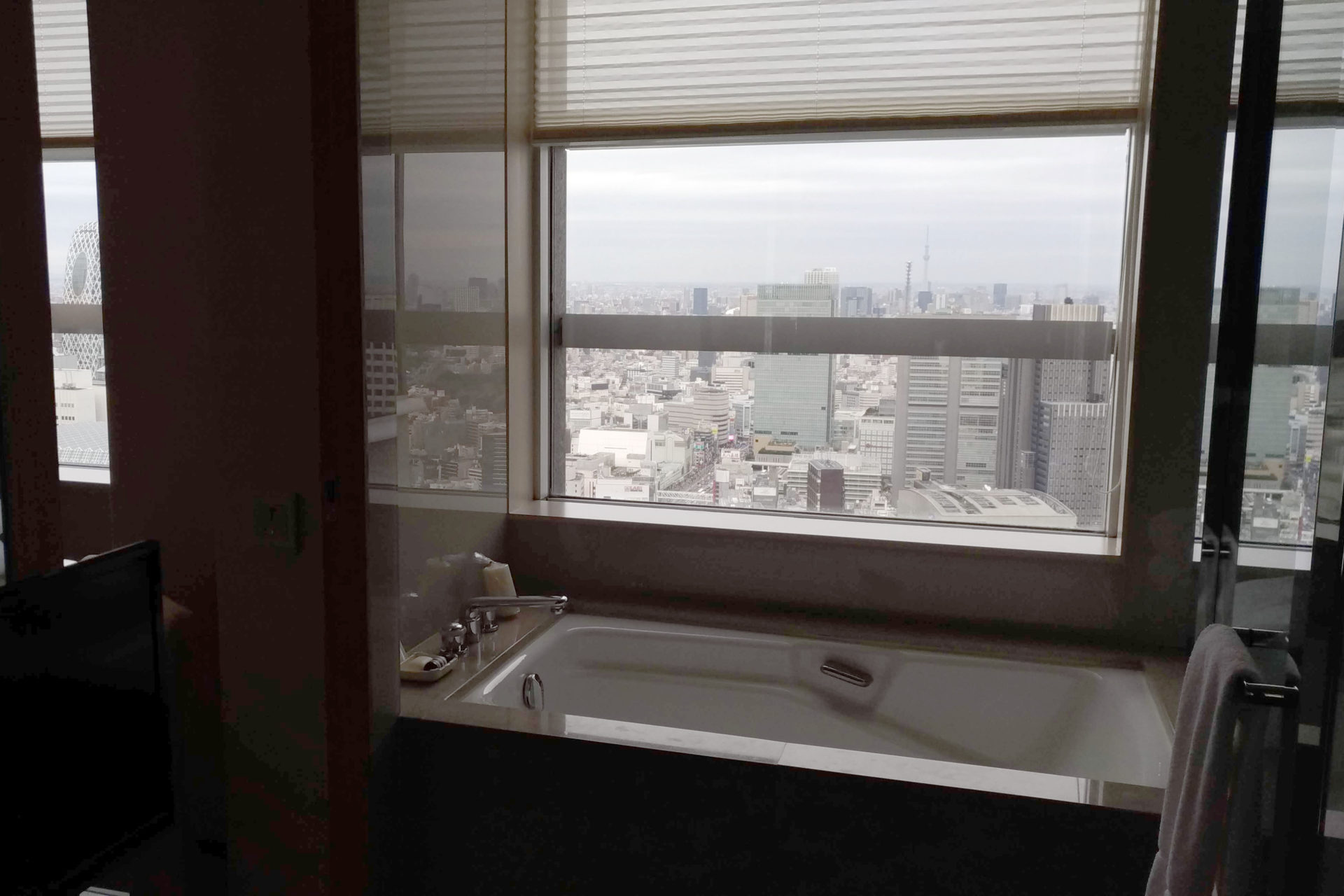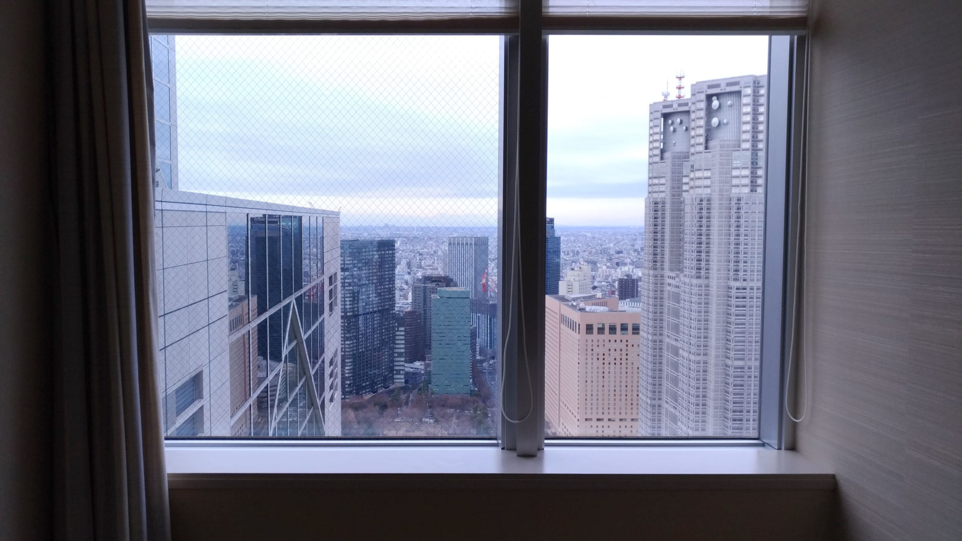 景色:窓下に西新宿の高層ビル群。新宿の夜景が一望できる。